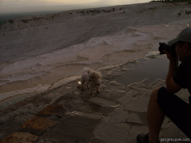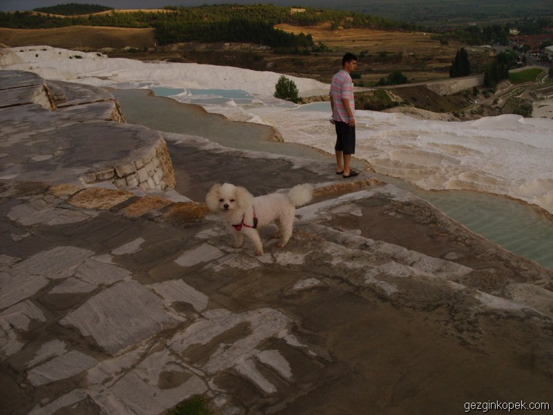 Toplantı sonrasında ilk ziyaret noktamız Pamukkale oldu. Biblo kendisi gibi beyaz olan her şeyi seviyor. Suyu sıcak olması biraz yadırgadı ama travertenlerin üzerinde rahat rahat gezindi. Pamukkale’ye yukarıdan girince bazı yerlerde suyun verilmediğini gördük. Önce suyun azaldığını ve sorun olduğunu düşündük. Ancak bu işlem Pamukkale’nin rengini korumak için suyu farklı zamanlarda farklı noktalara veriyorlarmış..İşte Pamukkale’den karelerimiz…